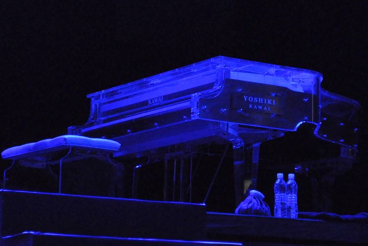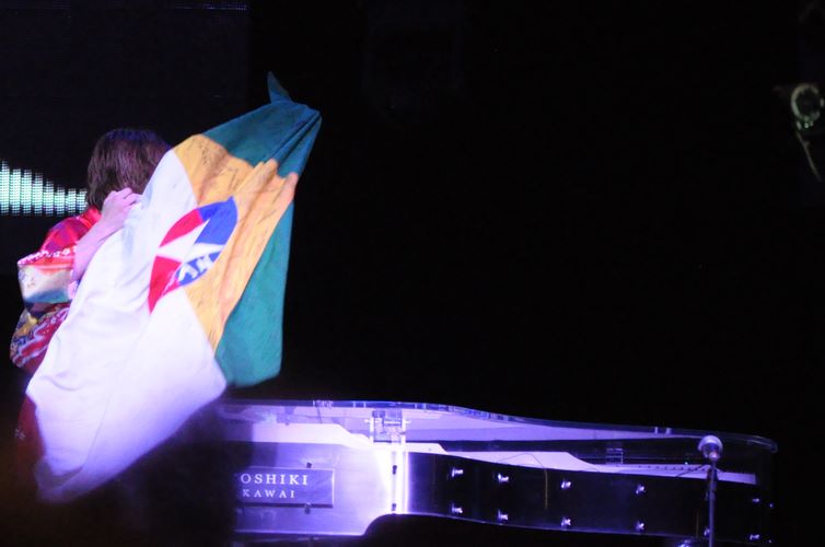 - Yoshiki cobre seu piano com uma bandeira nas cores do Japão e Brasil
