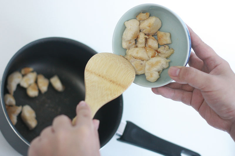 - Em uma panela, coloque uma colher (sopa) de óleo e 100g de frango picado grelhado e temperado com sal e pimenta do reino.