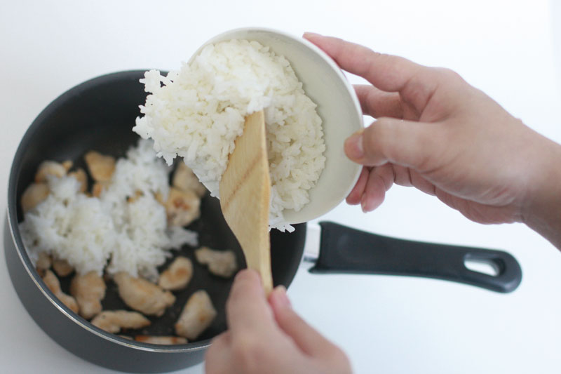 - Adicione uma tigela de arroz japonês cozido e mexa para não grudar na panela.