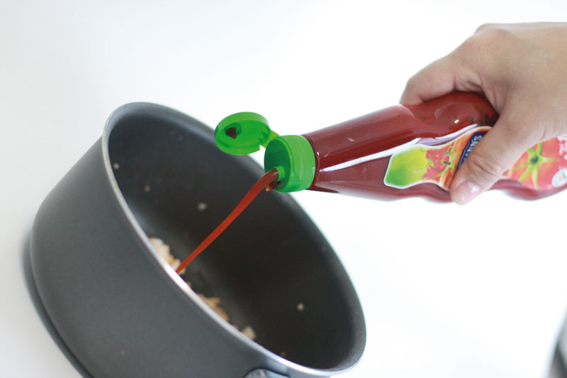 - Acrescente duas colheres (sopa) de catchup e um pouquinho de sal e continue mexendo até ficar tudo bem misturado.
