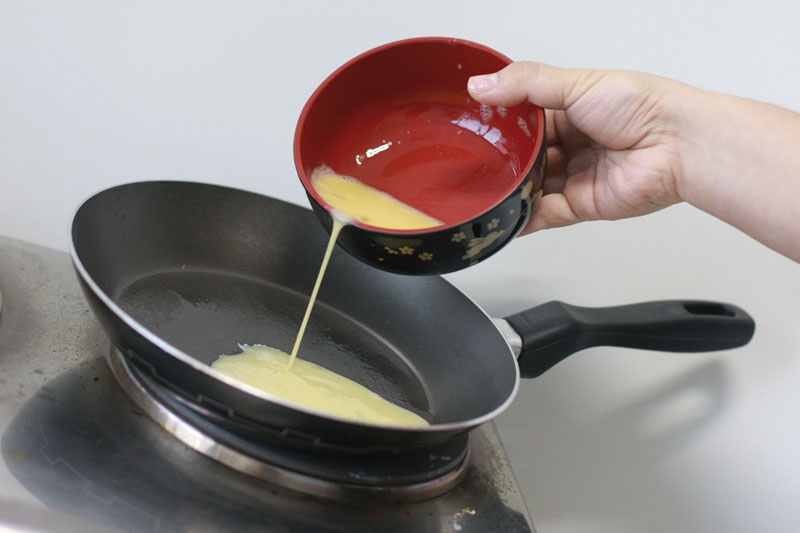 - Quando o óleo estiver quente, despeje os ovos batidos com muito cuidado.