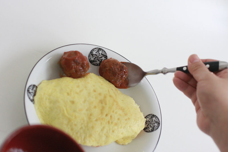 - Montagem passo 1: Arrume a omelete gentilmente em cima do risoto no prato.