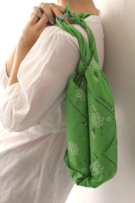 A bolsa de furoshiki pode ser feita em vários tamanhos para carregar qualquer coisa O nó do furoshiki pode ser aplicado em qualquer tecido. A vantagem é que ele é muito fácil de fazer e quanto mais se puxa, mais ele aperta. Para soltar o nó, entretanto, é muito simples: basta levantar um dos lados e deslizar.
