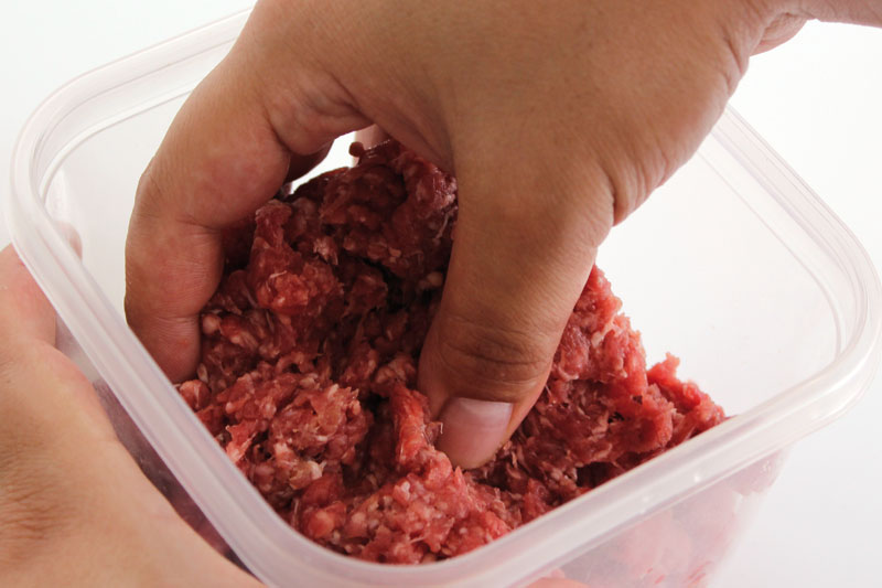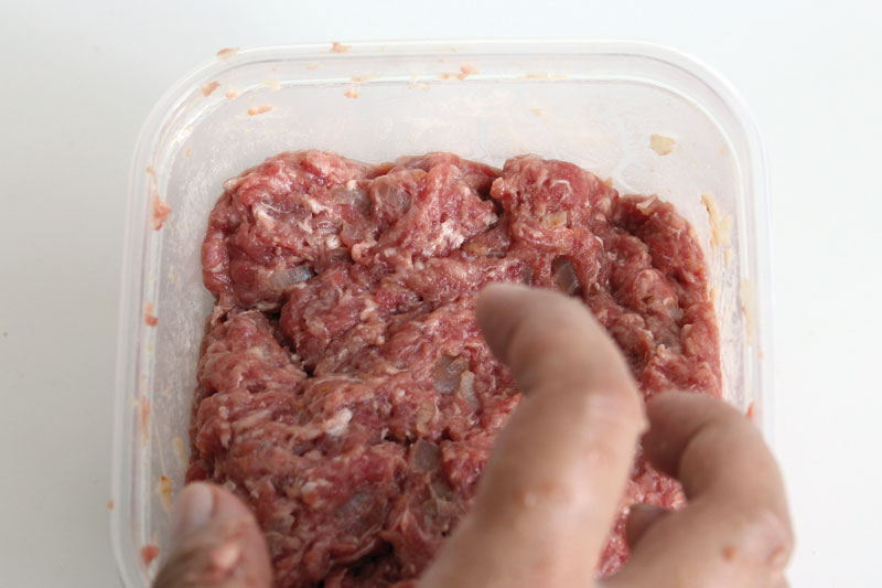 - Tempere a carne moída com sal e misture bem usando uma das mãos. Com a outra, segure firme o recipiente para ele não sair voando!