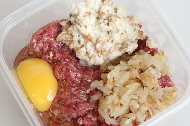 - Acrescente a cebola refogada, um ovo cru, o pão umedecido e uma pitada de pimenta-do-reino.