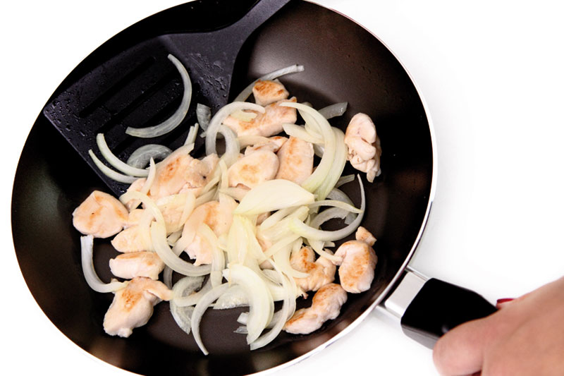 - Corte o frango em pedaços médios e frite em 1 colher (sopa) de óleo até ficar dourado. Em seguida, adicione a cebola fatiada para refogar.
