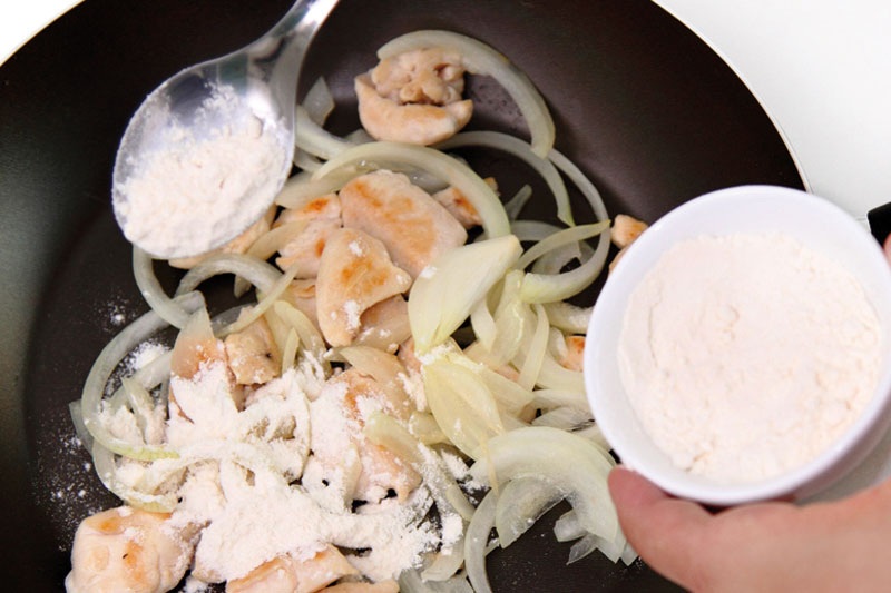 - Desligue o fogo para adicionar 2 colheres (sopa) de amido de milho. Misture bem para que seja incorporada pelos demais ingredientes e então ligue o fogo novamente. Refogue durante 3 minutos e fique atento para não deixar nenhuma pelota de amido.