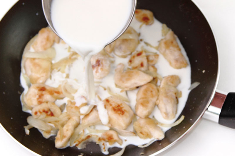 - Passo 5: Acrescente o leite, sal, pimenta-do-reino e uma colher (sopa) de queijo ralado na frigideira.