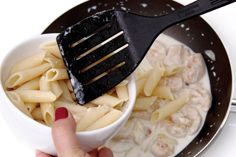 - Quando o leite começar a ficar cremoso, desligue o fogo. Então, acrescente o macarrão e misture para o molho ser incorporado.