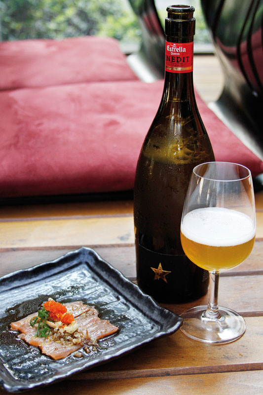 A Estrella Damm Inedit surpreendeu logo de cara, com sua garrafa-design, toda preta. Ela é um coupage único, uma textura cremosa, com suave carbonatação e retrogosto extremamente agradável. Cilene nos explica que em sua composição entram maltes de cevada e trigo, aromatizada com lúpulos e especia- rias como coentro, casca de laranja e alcaçuz. A segunda fermentação na própria garrafa po- tencializa sua complexidade aromática, frutada e floral, com notas doces no paladar.Para harmonizar , o chef Murakami propôs um sashimi de salmão marinado e crispy com flocos de tempurá e ovas de peixe voador. E a Estrella Damm Inedit continuou surpreendendo, pois tem uma capacidade de não conflitar com os sabores das comidas.