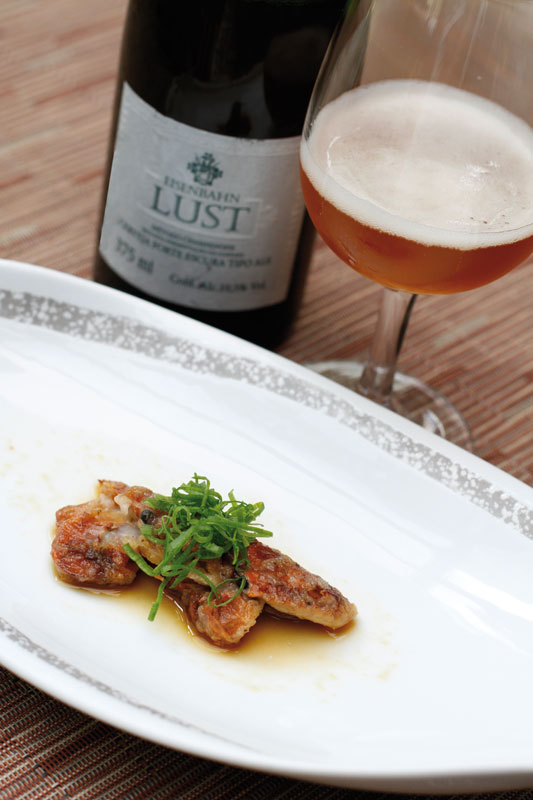 Começamos com a Sapporo Dry Lagger, de lata, com baixa fermentação e graduação alcoólica de 4 a 5%. Ela tem a maior parte do açúcar convertido em álcool devido ao longo período de fermentação, por isso seu sabor suave e seco. O chef Murakami propôs harmoni- zar com boranokô, ova de tainha, passada na chapa, com casquinha crocante. O sabor acentuado do petisco combina bem com a leveza do Dry Lagger, que é frisante e tem um leve amargor, o que dá uma sensação de limpeza do paladar sem chegar a interferir no prato.