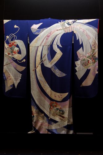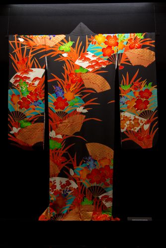 - Furisode cujo motivo central é o leque com representações de neblina e crisântemos