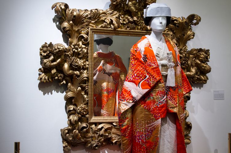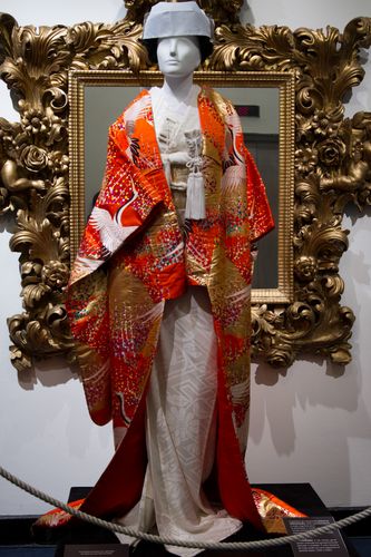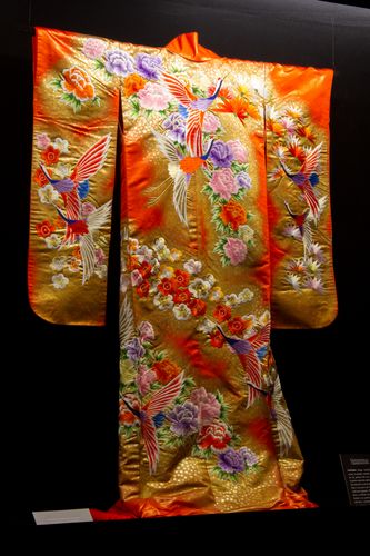 Réplica de um quimono de doze camadasA curadora convidada explicou que escolha de quimonos foi centrada em temas e alguns estão expostos em manequins para mostrar a complexidade da vestimenta também no ato de vestir, com os detalhes do obi (laço amarrado à cintura) e dos complementos como o obijime (corda amarrada sobre o obi) e flores que enfeitam o penteado. “Quando a gente resolveu juntar a exposição de arte e dos quimonos, resolvi trabalhar somente com os quimonos femininos porque são uma expressão de arte por si só”, disse.