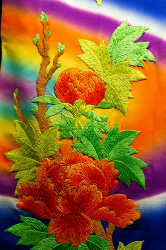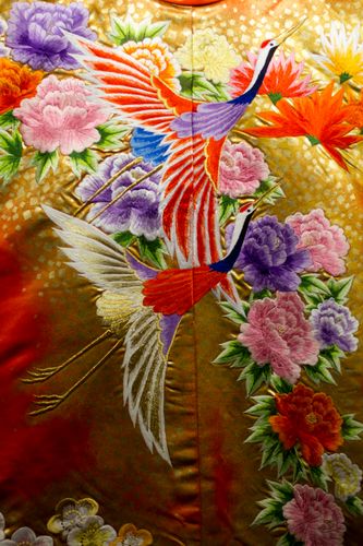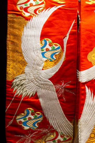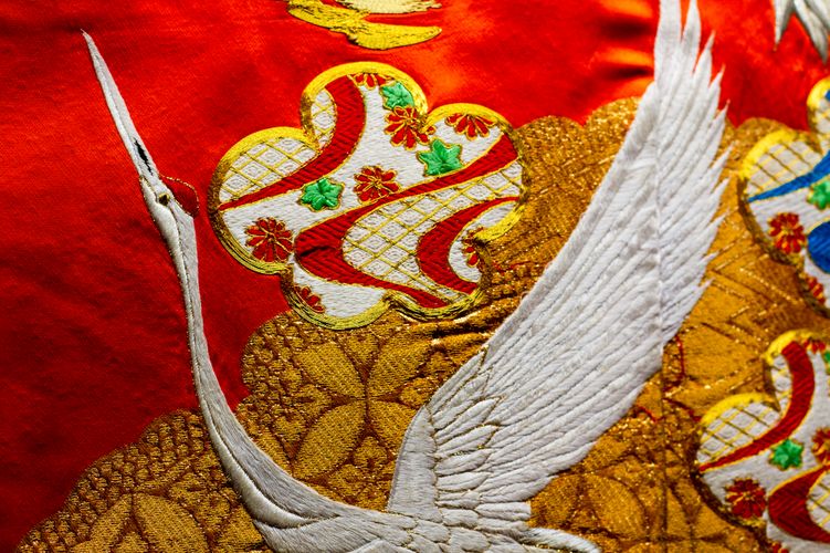 - Detalhe do bordado formando a imagem de um grou, símbolo de longevidade e prosperidade