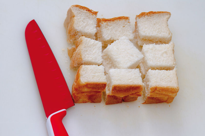 - Corte o pão de forma em três partes na horizontal e depois em três partes na vertical. Coloque uma fatia de pão em cima da outra para facilitar