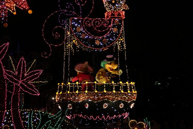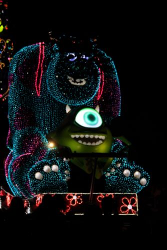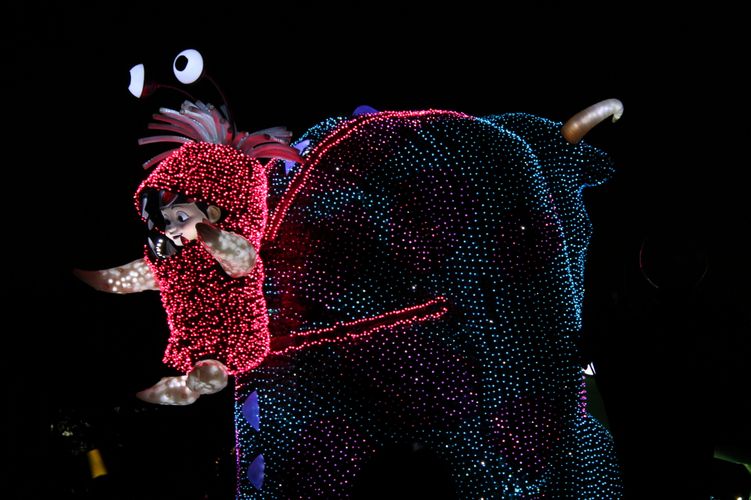 No desfile de rua, os personagens vinham em um carro bem luminoso, cada um em seu respectivo carro e cada um com jogo de luz diferente! Muito lindo! Um desfile mágico!