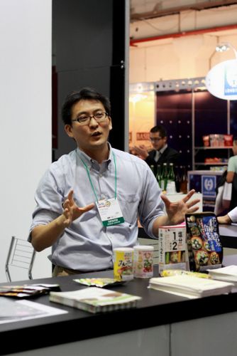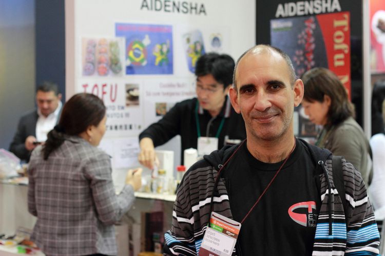 Takayoshi Oida apresenta os produtos da AidenshaA empresa Aidensha apresentou, em seu stand, os produtos de condimentos granulados para temperar alimentos, como a pimenta vermelha granulada, o gengibre e o yuzu (fruta cítrica japonesa). Como os grânulos são extraídos da matéria-prima natural quando submetidas a baixas temperaturas, o representante comercial Takayoshi Oida explicou que cada condimento preserva o aroma e sabor naturais.