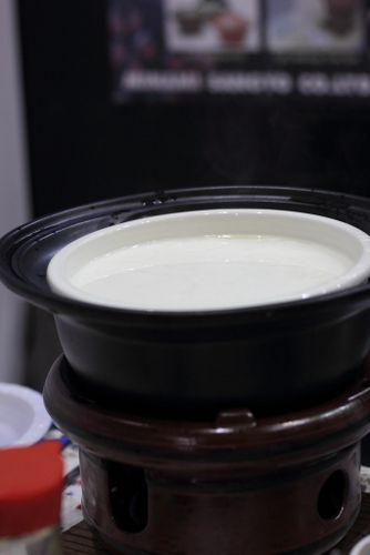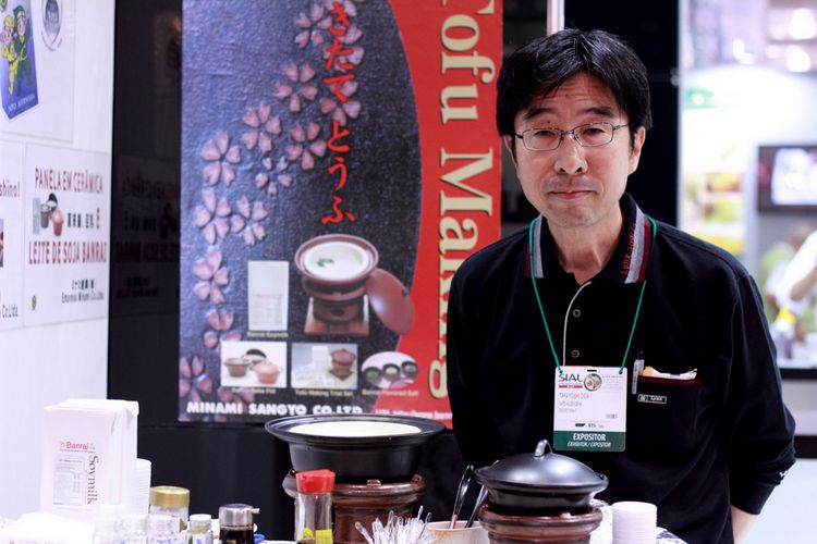 - Takyoshi Oida, representante da Aidensha, apresenta o tofu preparado com o leite de soja Banrai