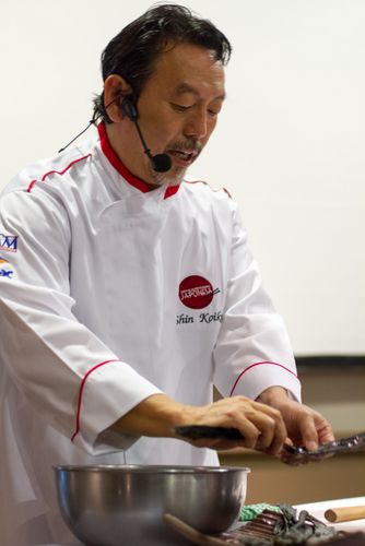 Na apresentação de Shin Koike, ele mostrou de onde vem o umami dos seus pratos. O caldo dashi, usado nos seus restaurantes, Sakagura A1 e Aizomê, é feito no modo tradicional, com alga konbu, cogumelo shiitake e flocos de peixe seco. “São três elementos muito importantes para a culinária japonesa”, explicou o chef. O “Konbu-jime de robalo” (veja receita no link) , por exemplo, é uma versão de sashimi, que já vem temperado com o caldo dashi. O umami do caldo realça o sabor do peixe e, dessa forma, não precisa ser mergulhado no shoyu.