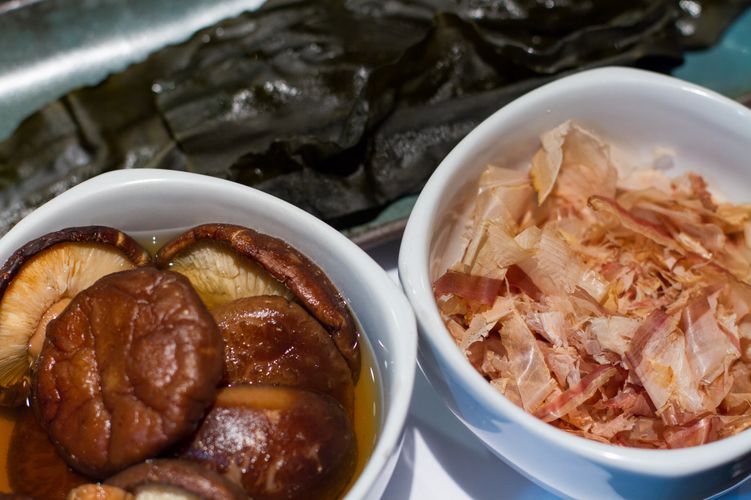 O caldo dashi é rico em umami e é feito com cogumelo shiitake, alga konbu e flocos de peixe seco