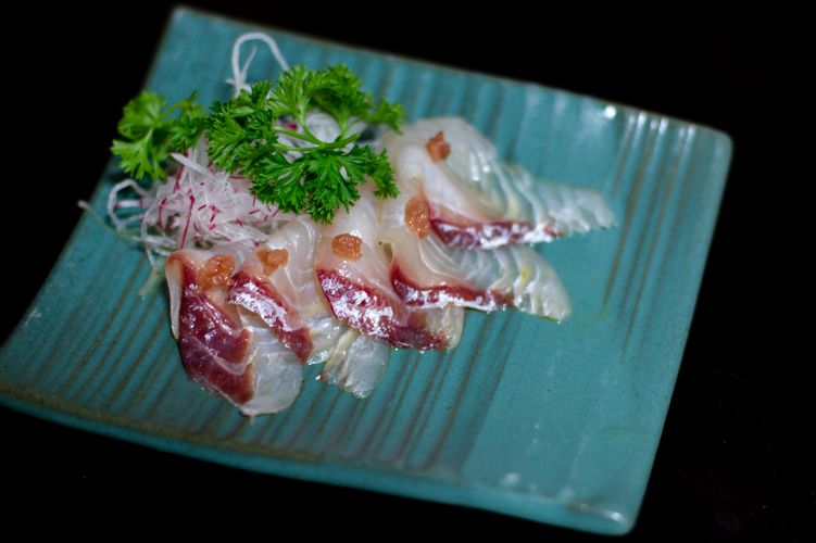 - Konbu-jime de peixe com molho Kaguen-su, com pasta de umeboshi (ameixa japonesa em conserva)