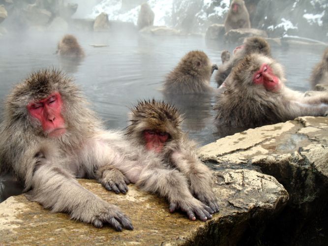 Ali, foi montado um onsen ao ar livre que é frequentado por macacos japoneses (conhecidos como “macacos da neve”). Como eles já estão acostumados com a presença de turistas, os animais agem naturalmente e interagem em seus bandos enquanto relaxam no onsen.