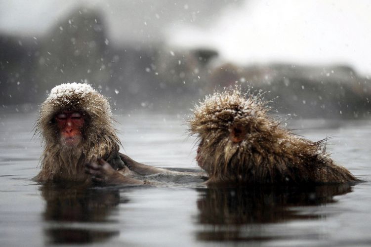 Macacos da neve aproveitam o onsen para se aquecer no inverno