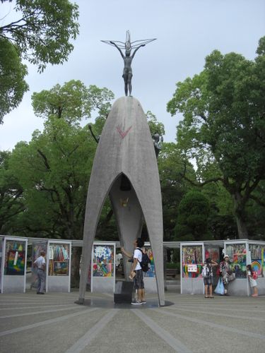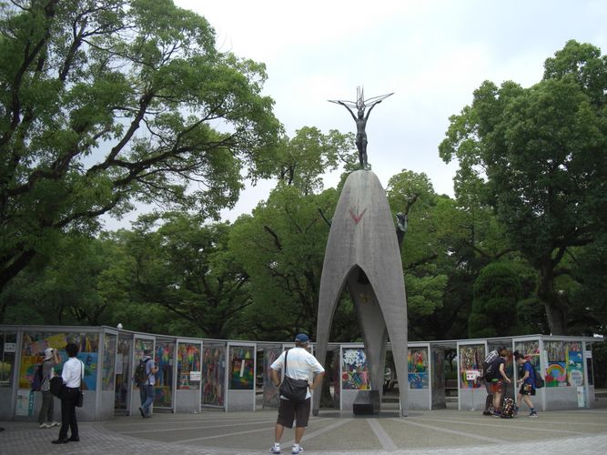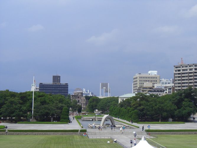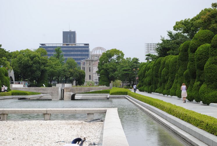 - O Parque Memorial da Paz fica em Hiroshima. Ao fundo, está o Genbaku Domu, a cúpula da bomba atômica