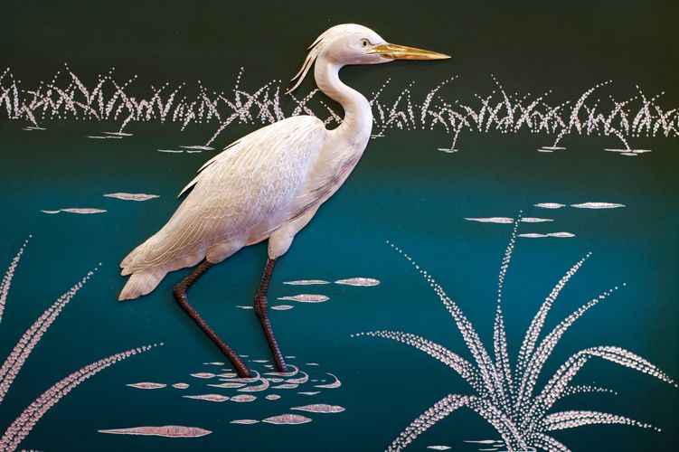 - Quadro feito com as técnicas kiridashi e tankin, com incisão e relevo sobre metal, por Nobuyoshi Mitsuhashi
