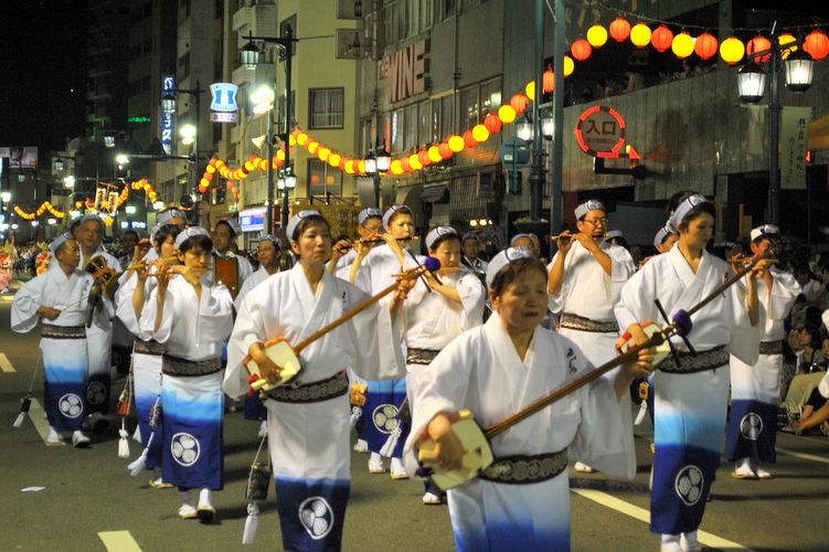 A banda acompanha os dançarinos com instrumentos tradicionais como a flauta de bambu, o shamisen, tambores e sinos.