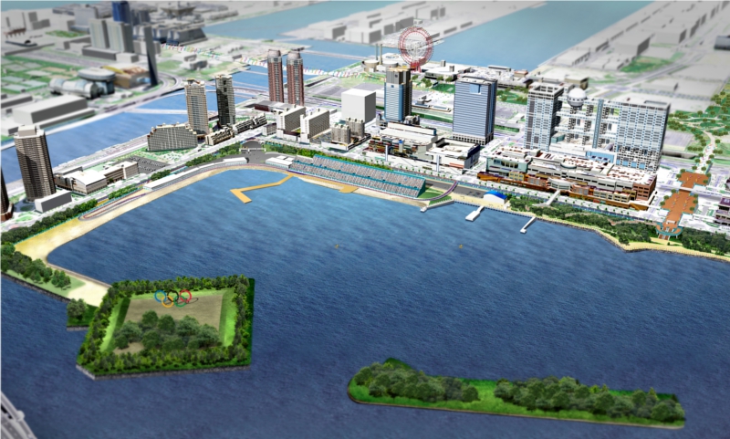 - A Zona do Patrimônio inclui o Estádio Nacional, à direita. A Zona da Baía de Tóquio, inclui o Centro de Transmissão Internacional à esquerda. E na intersecção das duas zonas está a Vila Olímpica