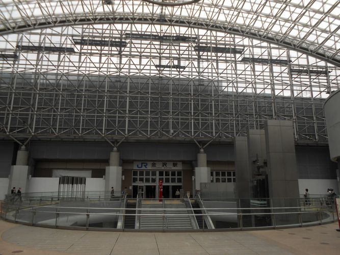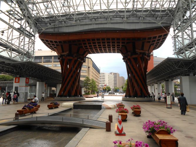 A estação de Kanazawa é bem bonita (foi concluída em 2005) e ao sair vemos uma cúpula de vidro chamada “Motenashi Dome” e um portão de madeira chamado “Tsuzumimon” que foi projetado para parecer com um Tsuzumi, um pequeno tambor japonês de mão, utilizado no teatro japonês, tanto no Nô quanto no Kabuki, assim como na música folclórica… (Kanazawa é a cidade do artesanato e da arte folclórica).