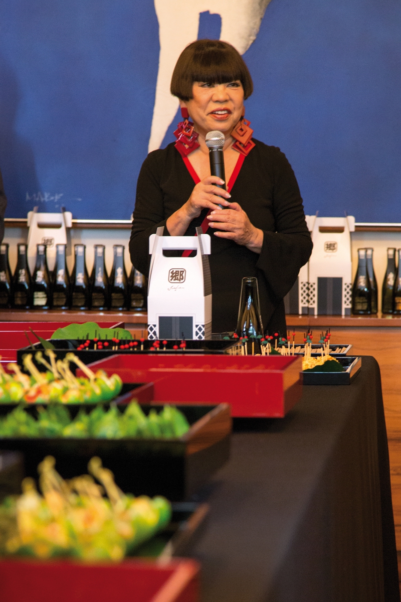- Junko Koshino mostrando a coleção de saquês artesanais do Japão, com embalagem e garrafa desenhadas por ela