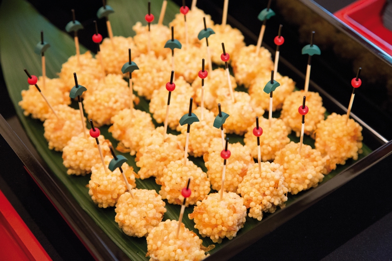 - Ebishinjo (pasteizinhos de camarão), envolto com arare (petisco japonês feito com arroz glutinoso)