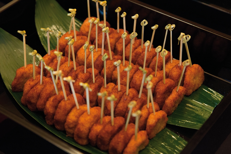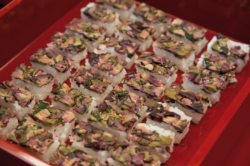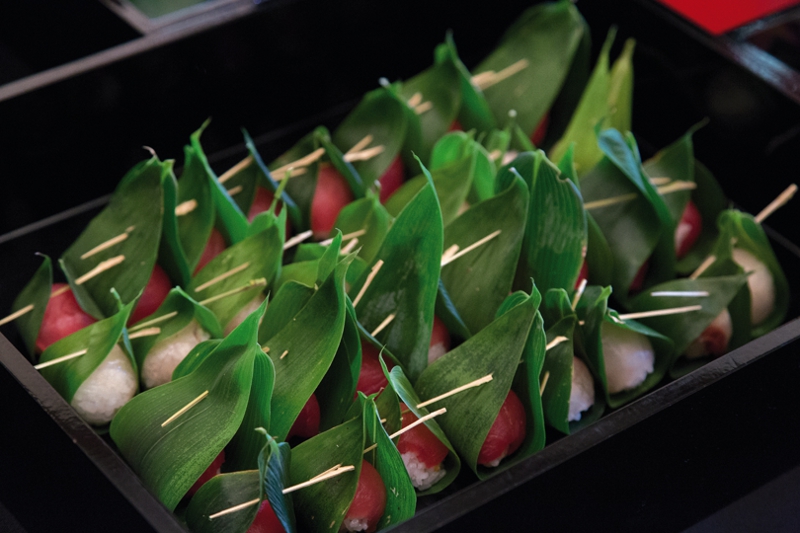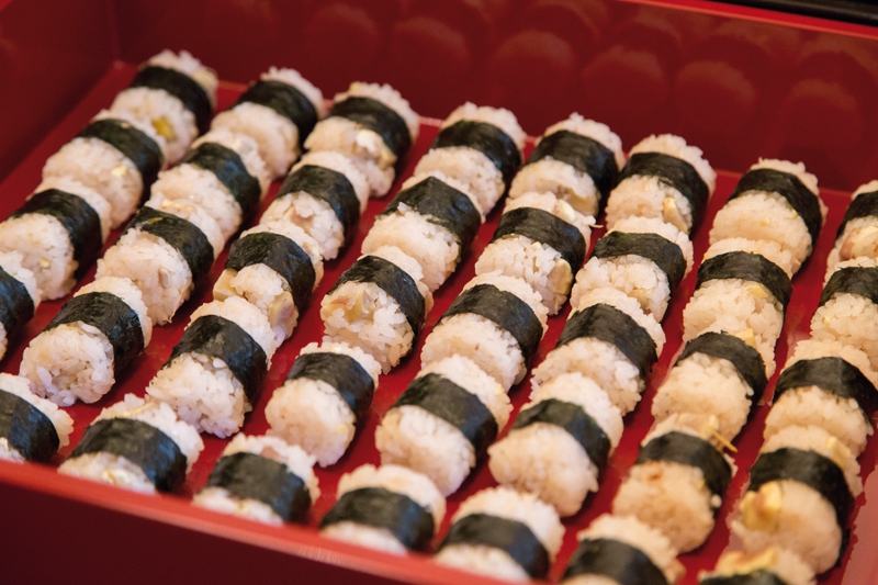 - Temarizushi (sushi em bolinhas) de atum envolto em folha de bambu