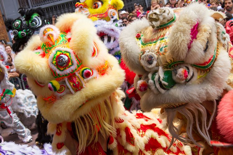 Com movimentos rápidos e intensos, a performance dos leões é feita por praticantes das artes marciais.