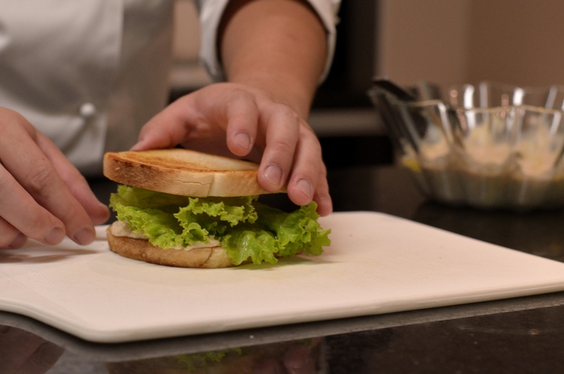 - Colocar o tuna mayo e uma folha de alface sobre um dos lados do pão. Fechar o sanduíche.