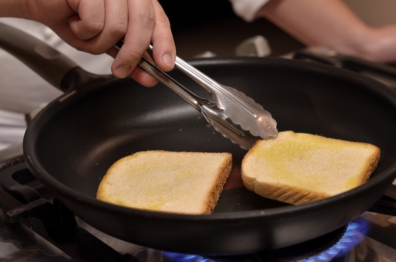 - Passo 3: numa frigideira, passar manteiga e dourar os pães. Pode ser feito em torradeira.