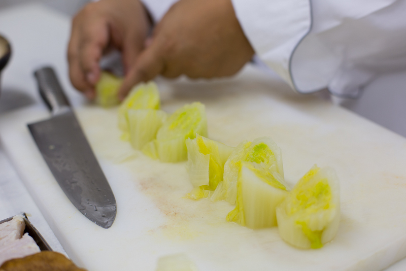 - Enrole as folhas de acelga com o auxílio de uma esteira e corte em oito partes. Coloque os pedaços de forma que as folhas se mantenham enroladas.