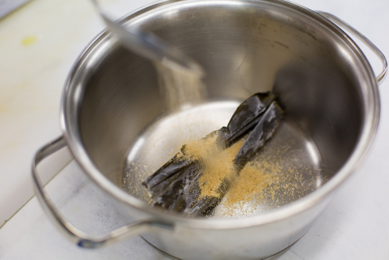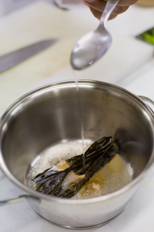 - Para o caldo, hidrate a alga kombu, adicione os temperos