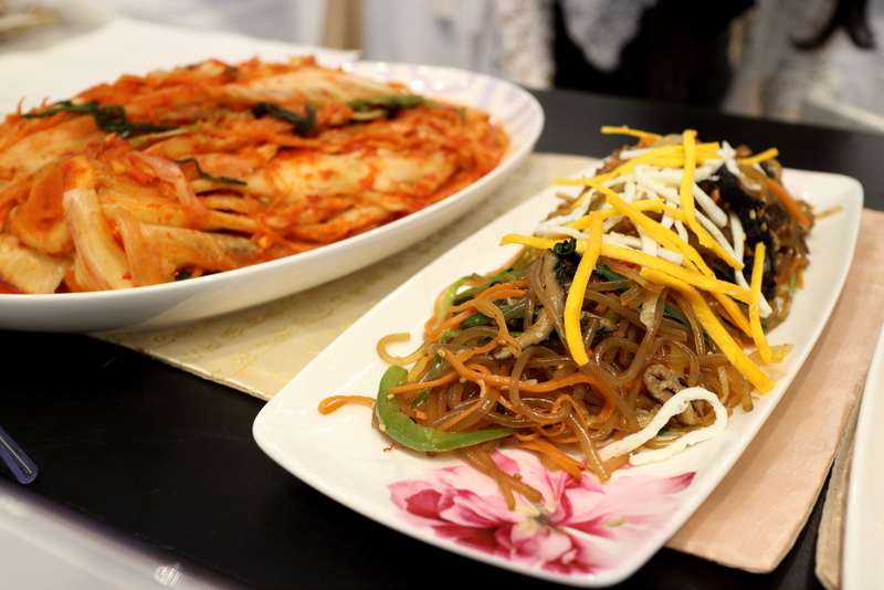 - Japchae, macarrão cozido com espinafre cenoura cogumelo carne e cebola