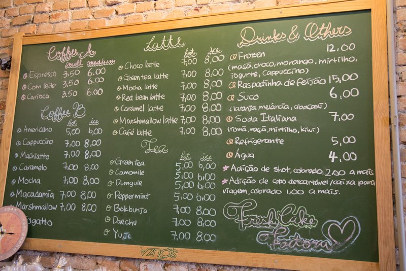 Na cafeteria Fresh Cake Factory, situada no Bom Retiro, no centro de São Paulo, o ambiente é uma mistura de cafeteria, padaria no estilo self-service e confeitaria. A vitrine tem algumas opções de bolos e choux creams. Na parede ao lado do caixa, o cardápio de bebidas apresenta uma variedade interessante de chás, cafés e outras bebidas, como o azuki latte (feito com o doce de feijão azuki e leite) que pode ser pedido nas versões quente ou fria.