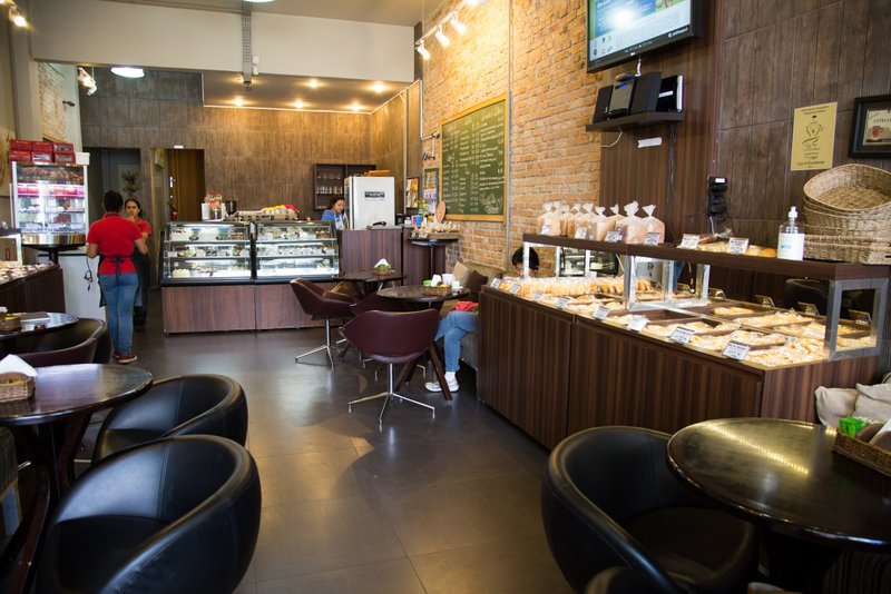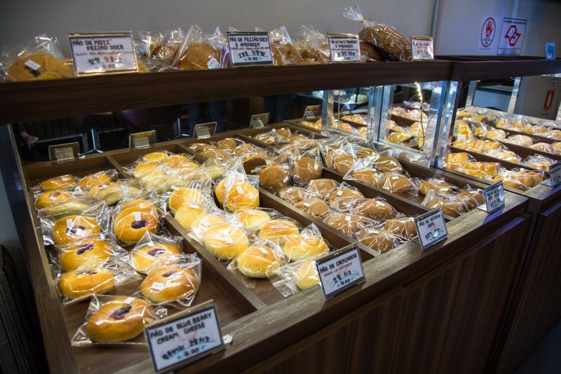 - Self-service no mesmo estilo de uma padaria coreana e japonesa. Na foto, bancada de pães da Fresh Cake Factory