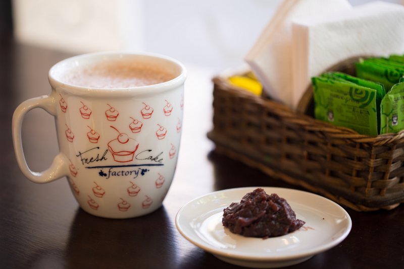 - Azuki Latte é preparado com leite e pasta de feijão azuki e tem notas leves de chocolate. A bebida pode ser pedida quente ou fria na Fresh Cake Factory
