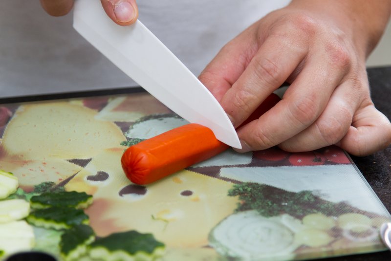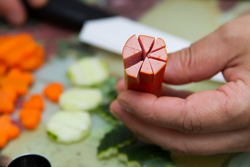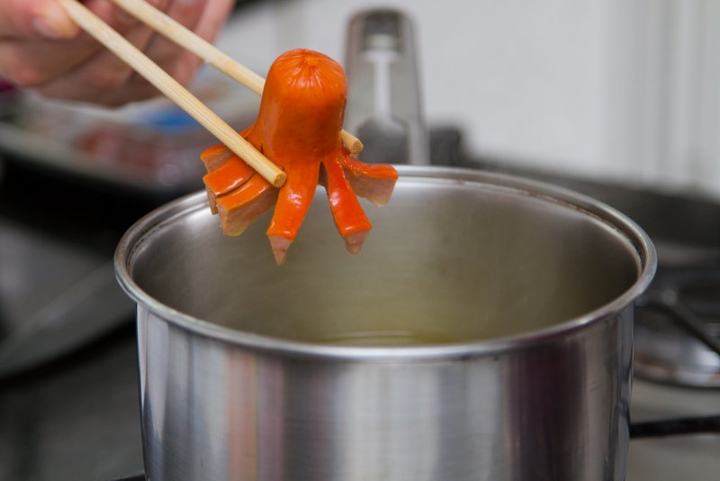 - Com cuidado, corte a salsicha em tiras, deixando pelo menos 5 cm sem corte (para formar a cabeça do polvo)