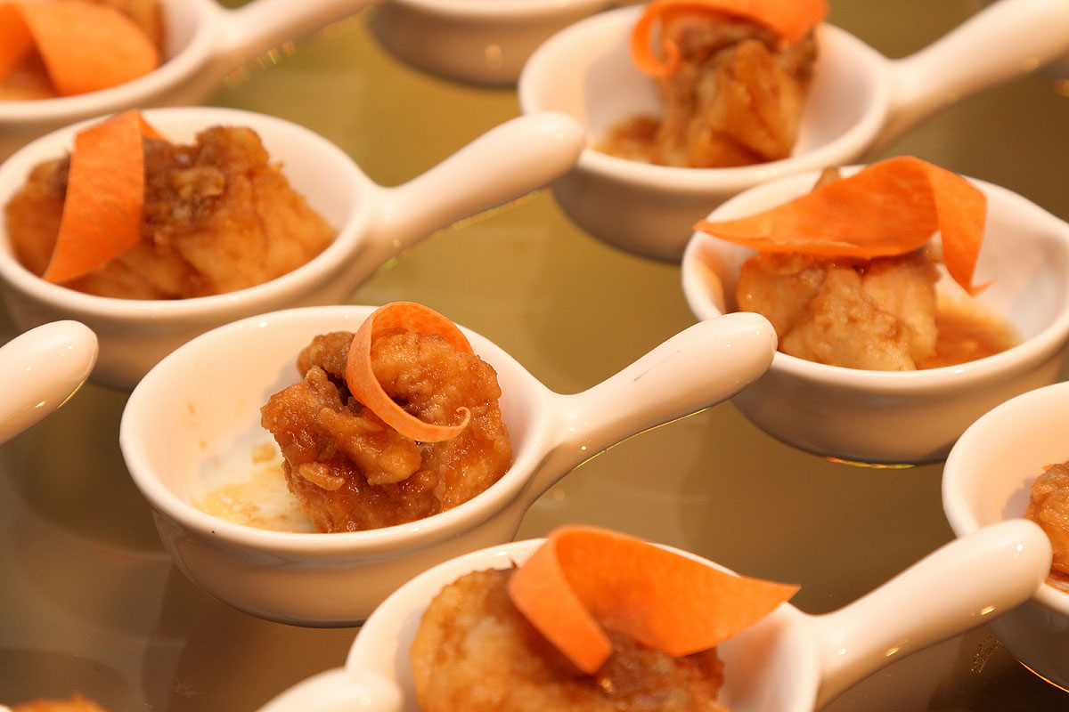 - Pargo empanado temperado com yuzu, servido no coquetel de abertura do festival, no dia 22 de junho de 2015