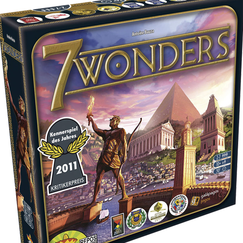 – 7 Wonders, onde cada jogador tem que administrar sua respectiva cidade, competindo por recursos e com o objetivo de conseguir construir suas próprias Maravilhas do Mundo. Esse jogo é o mais premiado do tabuleiro moderno, nos últimos 3 anos;