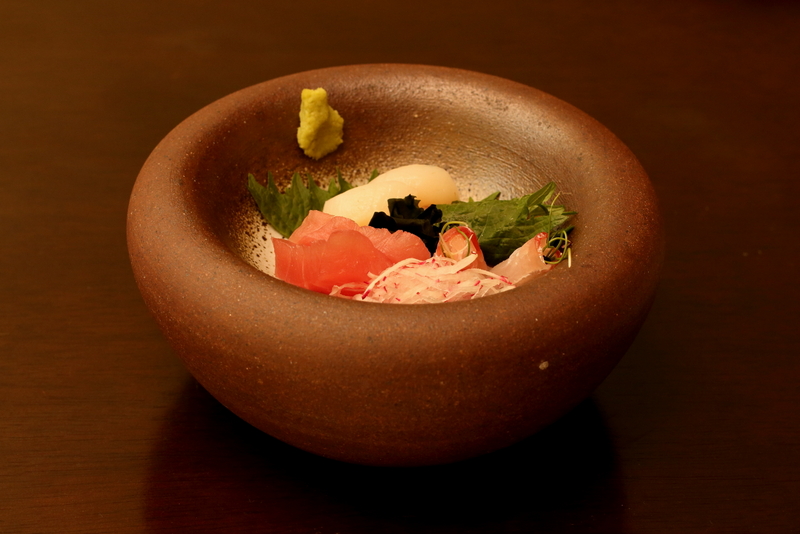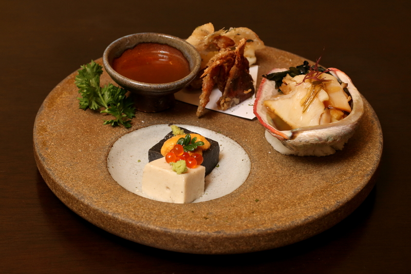 - Entrada com gomadofu, awabi grelhado e frituras de manjuba, lula, siri mole e renkon