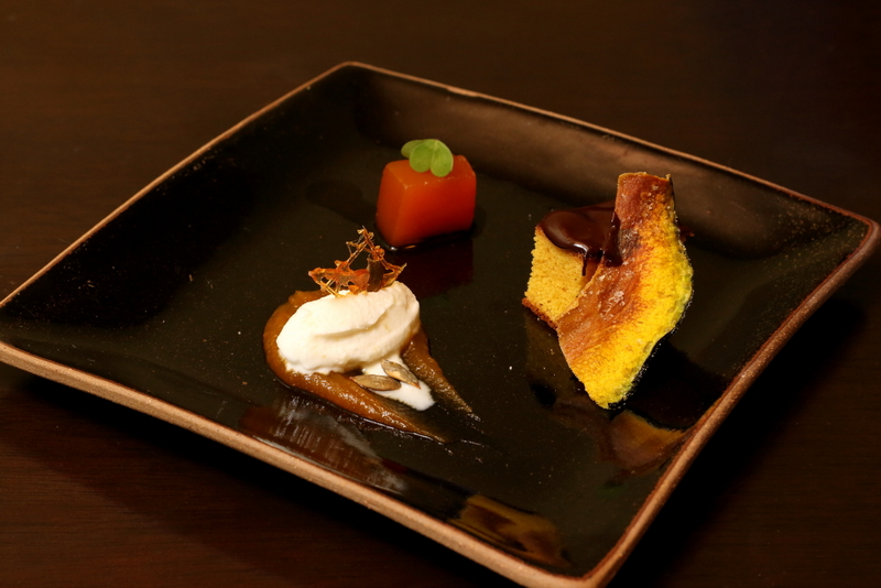 - Creme de kabocha com sorvete de gengibre, bolo de kabocha com calda e chocolate e shoyu e kabocha em calda trazem o clima do outono à sobremesa