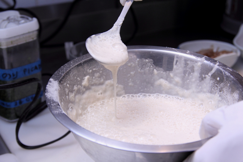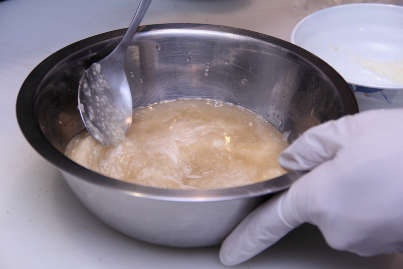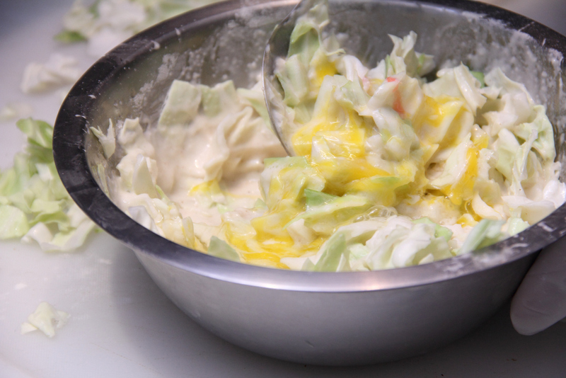 - Misture o repolho e o benishoga à massa e quando ele estiver envolvido pela massa, adicione o ovo sem misturar demais.